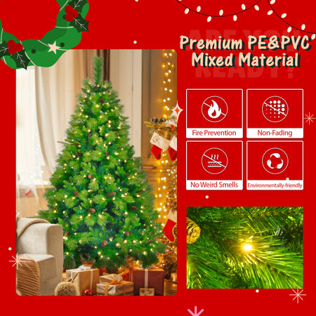 Festival the holidays in style with this 6-foot pre-lit artificial tree set featuring 350 warm LED lights, lush PVC & PE branches, and realistic pine cones. The set includes a matching 9-ft garland and 1.6-ft wreath with additional LEDs, bringing festive warmth to your home, office, or holiday party. Built with durable, non-allergenic materials and an easy hinge design, it’s quick to assemble, reusable, and designed for long-lasting seasonal beauty.